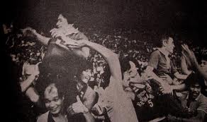 Crispa’s Danny Floro and coach Baby Dalupan gets the victory ride.