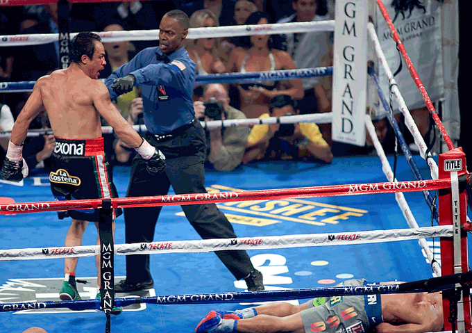 The second one was excruciatingly more painful, coming with just a second left in that fateful 6th round, and JuanMa’s nose bloodied and broken. With JuanMa desperately trying to breathe through his mouth, not a few boxing aficionados were predicting then that it was just a matter of time before the Mexican warrior would wave the white flag. Except that Manny walked right into a picture-perfect right straight, rendering him unconscious for what seemed like an eternity.