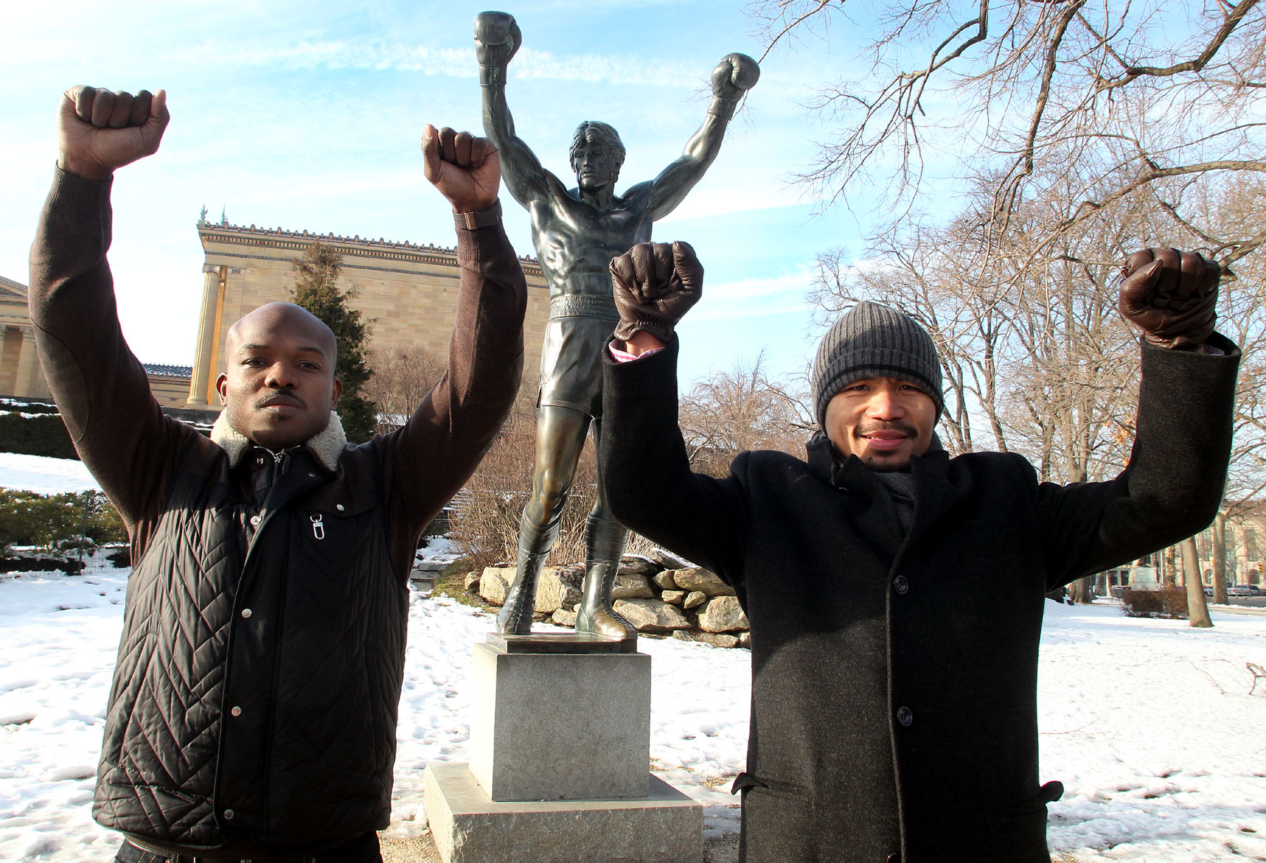 Feb. 7, 2014, Philadelphia, Pa. — ” JUST LIKE ROCKY” — (L-R) Undefeated WBO World Welterweight champion Timothy Bradley and superstar Manny Pacquiao make a special visit to the famous “Rocky” statue at the Philadelphia Museum of Art on the final stop on their media tour.