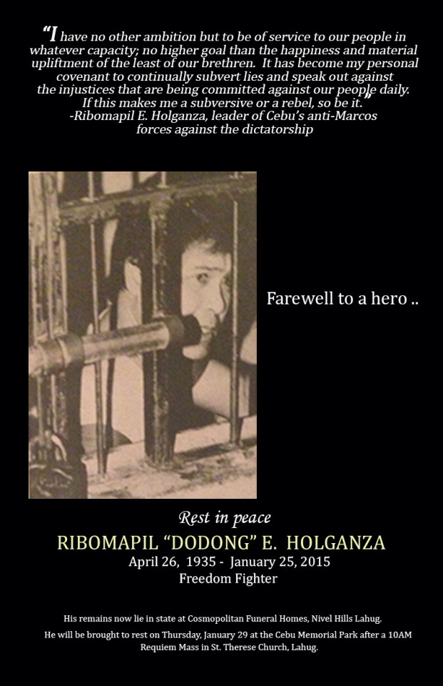 My uncle, Ribomapil ‘Dodong’ Holganza, passed away last Sunday, 25 January 2015. He will be remembered with fondness and love. This article below is a tribute to Dodong Holganza, whose determined defiance against the Marcos dictatorship during the Martial Law years defined him. Bong Wenceslao, himself a former detainee during his younger days, writes with pride about those difficult days; in the hope that we may remember, appreciate, and learn to thank the nameless people who – like Dodong – risked life and limb for this thing they called freedom. This is Bong’s salute to our Martial Law heroes, as embodied by my Tio Dodong.