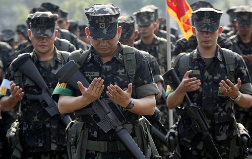 Philippine army soldiers pray during an interfaith prayer event at the military headquarters in Camp Aguinaldo, Quezon City, metro Manila May 3, 2010. The prayer event was held to pray for a peaceful election where more than 50 million Filipinos will elect a president, a vice president, nearly 300 lawmakers in the two-chamber Congress and more than 17,500 local government seats on May 10. REUTERS/Rouelle Umali (PHILIPPINES – Tags: POLITICS MILITARY RELIGION)