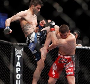 Nick Diaz takes a knee from Carlos Condit during their UFC interim welterweight mixed martial arts title match, Saturday, Feb. 4, 2012 at The Mandalay Bay Resort & Casino in Las Vegas. Condit won by a unanimous decision. (AP Photo/Eric Jamison)