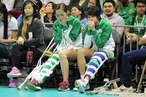 Ateneo was unmistakeably head and shoulders above the rest. La Salle’s Lady Spikers, grizzled ex-titlists that they were, were expected to crowd the Lady Eagles for the title. But their dream of regaining that coveted crown was shattered when their MVP candidate and team captain, Ara Galang, fell injured in the last few minutes of their face-off game against the NU Lady Bulldogs. That crucial step-ladder game was for the right to meet the Lady Eagles in the prestigious finals. And as she lay grimacing like Humpty Dumpty after that great fall, the fans in green could only groan as they watched their quest for the crown slowly fading away. For now, ‘all the king’s archers and all the king’s men, couldn’t put the crown together again’.