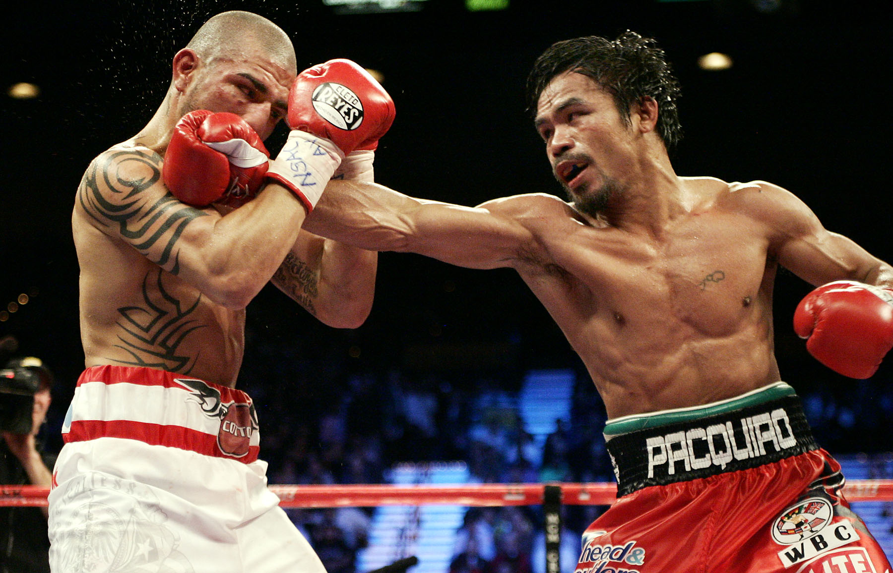 11/14/09,Las Vegas,Nevada — Manny “Pacman” Pacquiao(R),General Santos,Philippines stops Miguel Cotto, Caguas, Puerto Rico in the 12th round Saturday night at the MGM Grand in Las Vegas. — Photo Credit : Chris Farina – Top Rank (no other credit allowed) copyright 2009