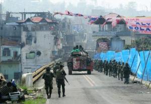 An Armoured Personnel Carrier (APC) and government troops march towards Mapandi bridge after 100 days of intense fighting between soldiers and insurgents from the Maute group, who have taken over parts of Marawi city