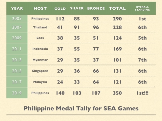 Congratulations to our national athletes for winning the overall championship in the recently-concluded SEA Games medal race! After years of languishing in 5th to 7th place in the biennial South East Asian (SEA) Games, the Philippines is finally lording it over the field once again; with an eye-popping 149 golds, 117 silvers and 121 bronzes; winning the overall crown with plenty to spare.