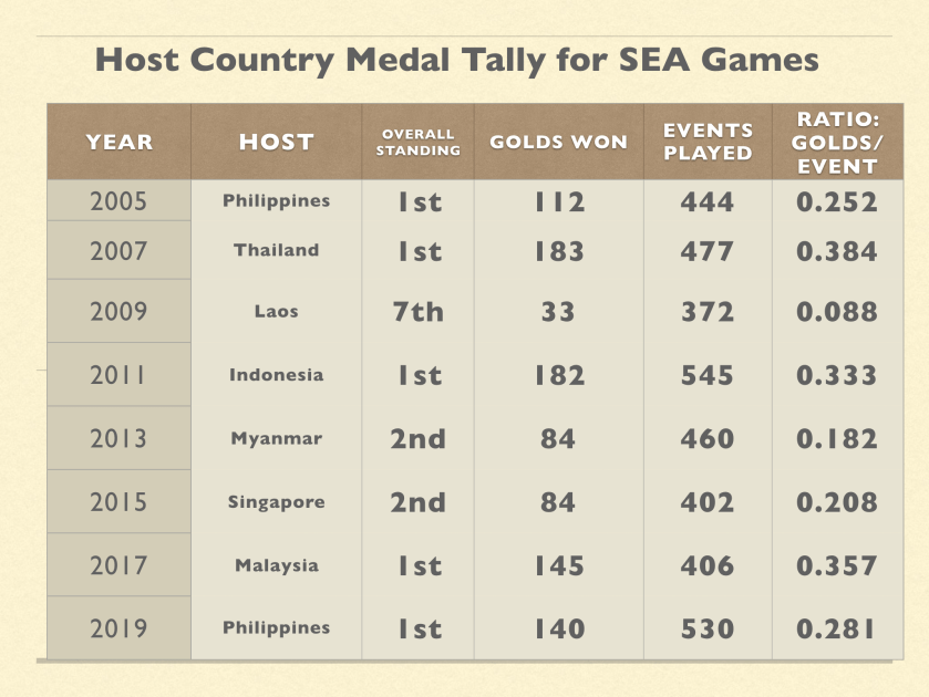 And second is the homecourt advantage. Playing at home gives you a huge advantage with being able to maximize the number of participants, being familiar with the playing conditions, being acclimatized, having the presence of a strong cheering crowd, etc. At times, the cheers and jeers of the crowd can also influence referees and officials. (Next week, we try to analyze how the country amassed its precious gold haul in more detail.)