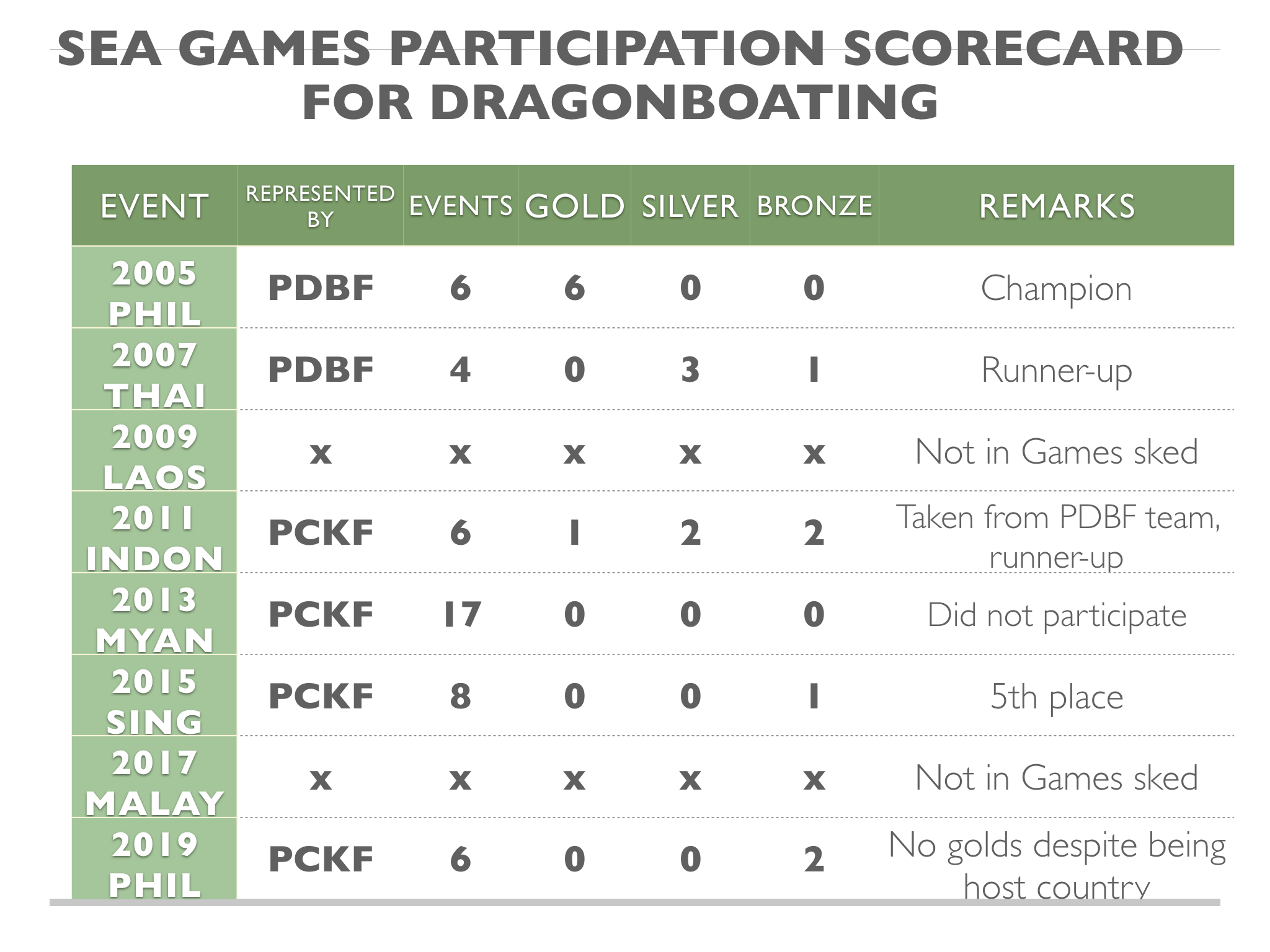 In Dragonboating, the self-proclaimed world champions Philippine Canoe Kayak Dragonboat Federation (PCKDF), could only muster 2 bronzes despite the homecourt advantage. Promising at least 5 golds after their ‘triumphant’ world-champion stint in the USA, the PCKDF grasped for more excuses to justify their non-performance. It will be recalled that the team had enumerated a long list of alibis in the past Asian and SEA Games: from a false start, to the use of boats unfavorable to them, to lack of funds to bring in an extra steersman, to lack of time to acclimatize with the local conditions, etc. This time, the alibi is a divine wind blowing specifically against the Philippine lane We wonder what else they can think of next.