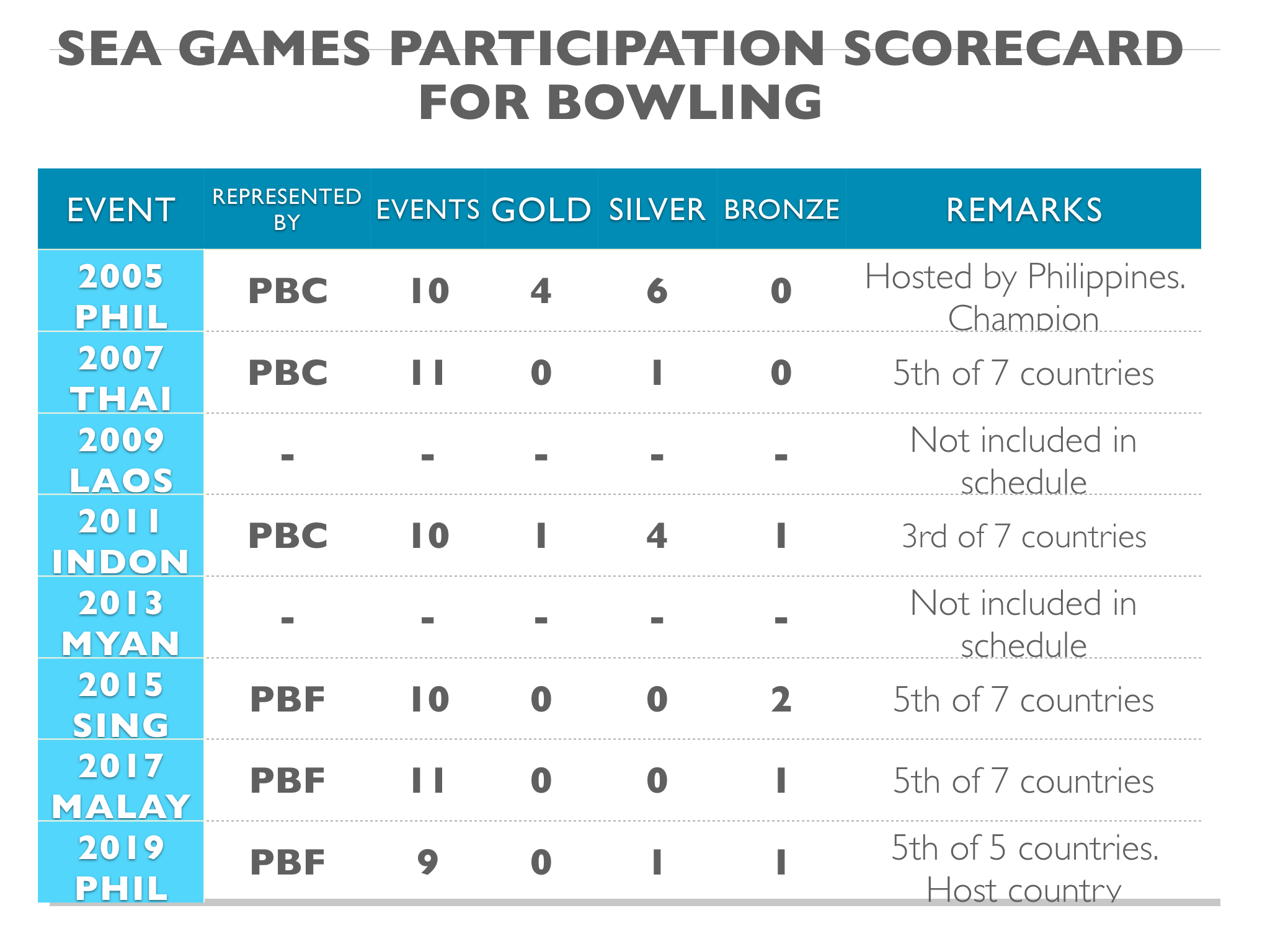 The same holds true for bowling. The newly-minted Philippine Bowling Federation (PBF) occupied the last place as it could only muster 1 silver and 1 bronze despite a clear familiarity of the lanes, plus the home fans cheering. It will be recalled that the country used to dominate this sport as late as a decade ago. (Please read: Philippine Bowling Cries For Justice.) The removal of the Philippine Bowling Congress (PBC), and its eventual replacement by the PBF; the disunity engendered leading to the factionalism among the major bowling associations; all these have resulted in the miserable results in the medal race.