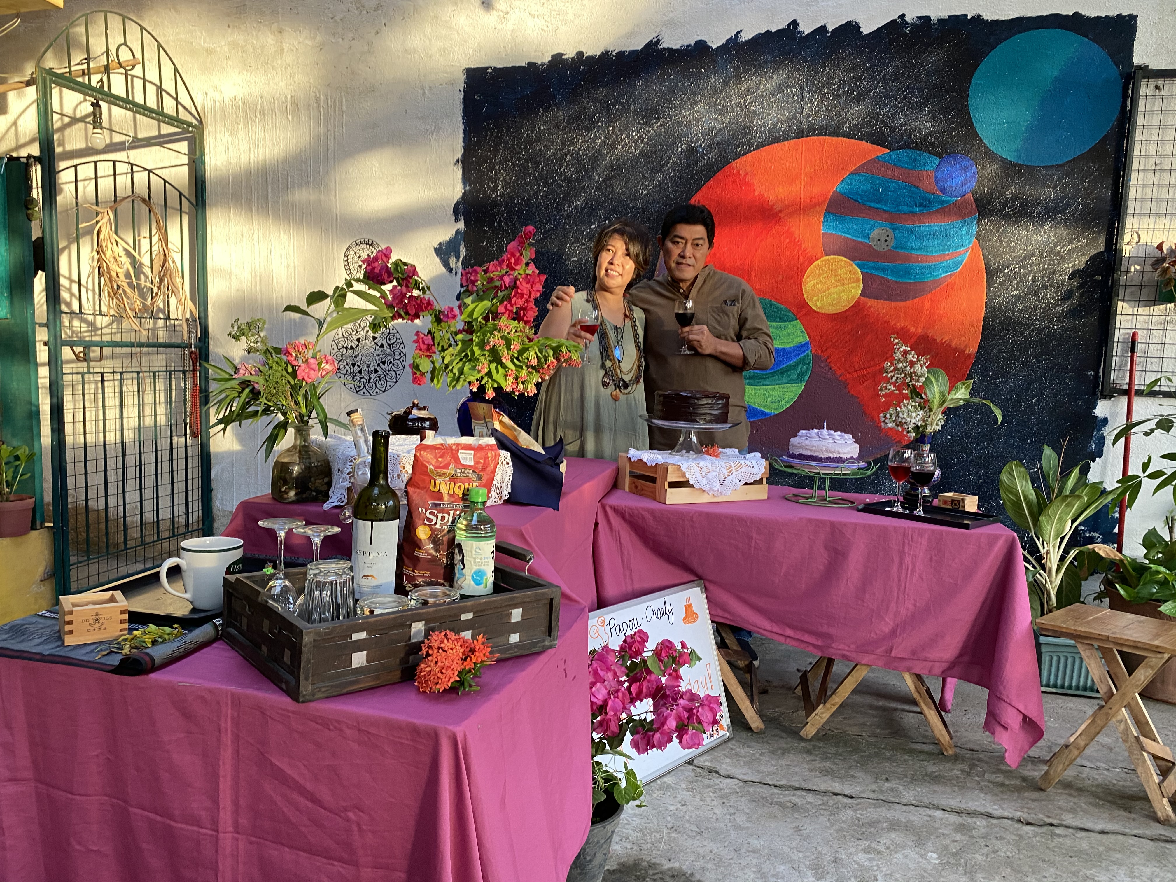 Thanks to my tireless wife, she had our front lawn readied for our small celebration. She had the huge mango tree trimmed, and magically turned our lawn into a small veggie garden. And she had the garage wall painted. My son, Josh, did some artwork and things looked amazingly different in time for my bday party.