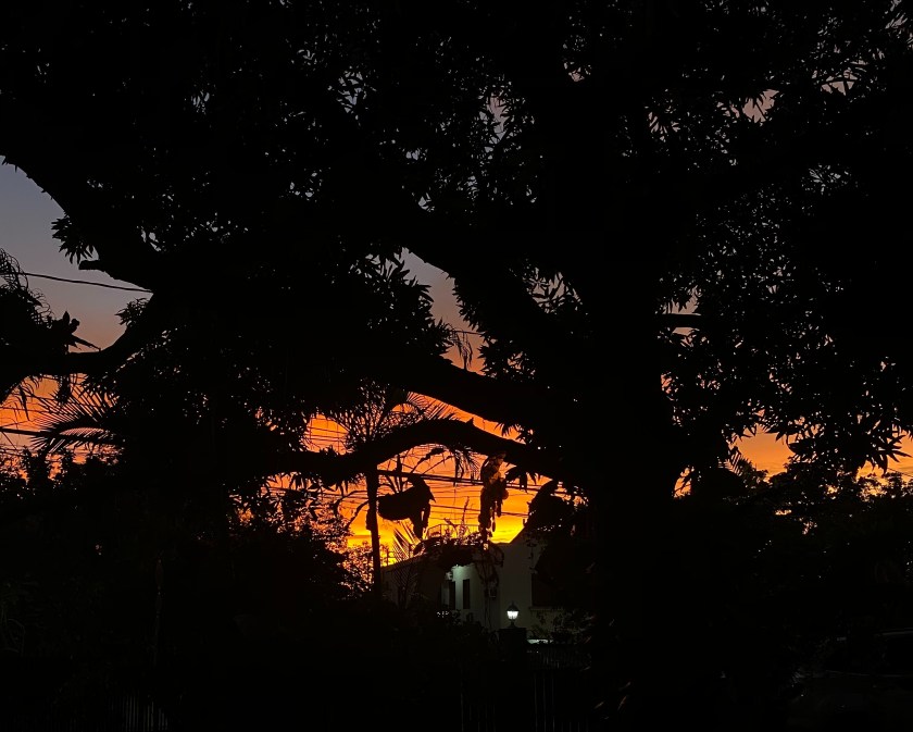 A helmeted Josh gives the old mango tree a long-deserved trim.