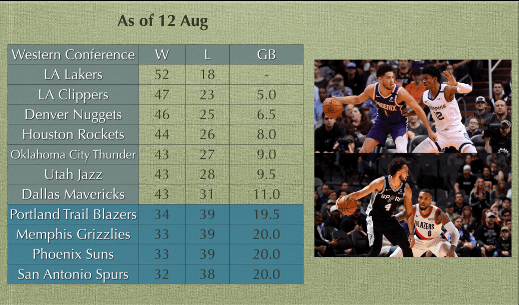The spotlight now focuses on the 4 bloodied but unbowed gladiators still engaged in mortal combat. The Portland Trail Blazers (34-39), with the dazzling Dame demolishing the opponents. The Memphis Grizzlies (33-39), with Ja Morant jamming more runs. The Phoenix Suns (33-39), with the divine Devin Booker booking 7 straight wins for a fabulous Phoenix finish. And the San Antonio Spurs (32-38), with the X-Men’s Professor X disguised as coach Pop, willing his band of non-stars into the playoff equation. At stake is the 8th and last seed in the West, and the chance to exchange elbows with Lebron and the mighty LA Lakers in the first round of the playoffs.