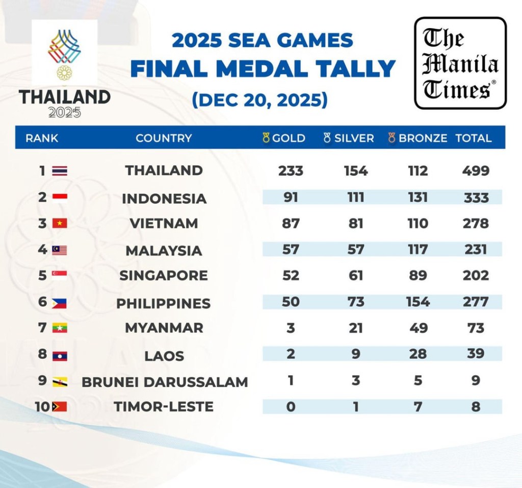The Philippines finished 6th in the overall medal standings at the 2025 Southeast Asian Games, securing 50 golds. This result stands in contrast with the performance of some smaller or less populous neighbors – Thailand, Vietnam, Malaysia and Singapore – which tallied higher gold counts and, in the case of Thailand and Vietnam, more medals.